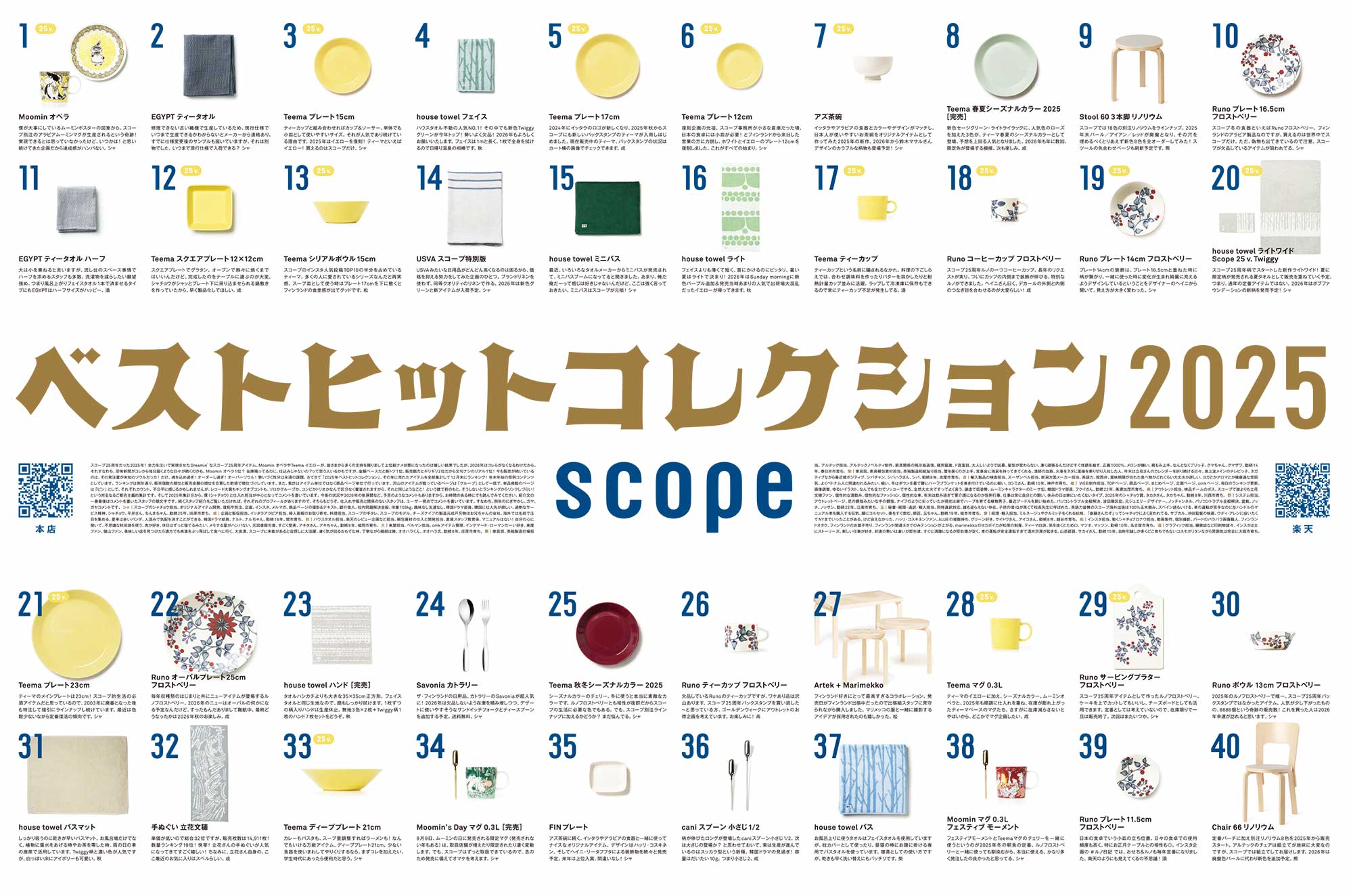 オールフィンランドロケで作ったオールティーマイエローの緩衝誌。表面はハンナさんの家の食洗機、歴代のARABIAバックスタンプに混ざっているのはSCOPE 25 v. 2025と刻印されたスコープのイエローピーヤ!裏面タイトルのアルファベットはスコープが行った事のある建物やお店から。スコープ的著名人にシャチョウが聞いた「実際のところティーマイエロー使ってる!?」な垂れ流しインタビューもクシャクシャを伸ばして是非読んでみて欲しいです。