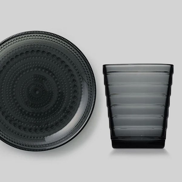 ブラック&ホワイトのテーブルでも相性が良いダークグレー。残るはAino Aalto タンブラー、ハイボール、Kastehelmi プレート17cm、ボウル230mlです。