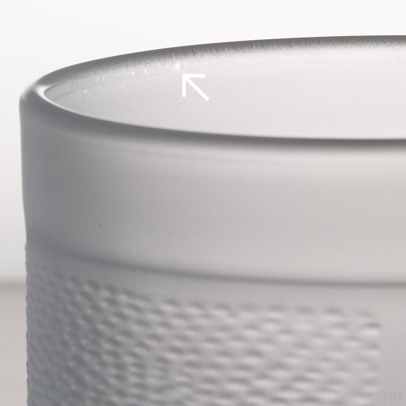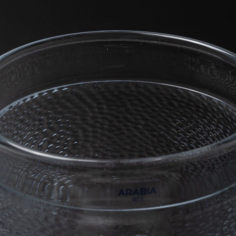 オイバ・トイッカが1973年にヌータヤルヴィでデザインしたビールジョッキ、Krouvi(クロウヴィ)。プレスガラスで製造された、丈夫で安定感のあるビアグラスです。容量を示すメダル状のエンボス、霜のような細かな凹凸が全面を覆う表面加工、そして安定感のある太いハンドルが特徴です。もともとはレストラン向けの業務用として考案されたそうですが、やがてフィンランドの一般家庭にも広がり、特にサウナのあとの一杯として親しまれてきたアイテムです。今回はフィンランドの企業から大きなオーダーが入り、久しぶりに再生産されることとなったため、スコープも相乗りさせてもらいました。フィンランド語の"Krouvi"とは、「居酒屋」という意味の言葉です。少しくだけたニュアンスで使われることが多く、気軽に集まって楽しくお酒を飲むのにぴったりなグラスです。
