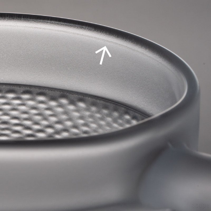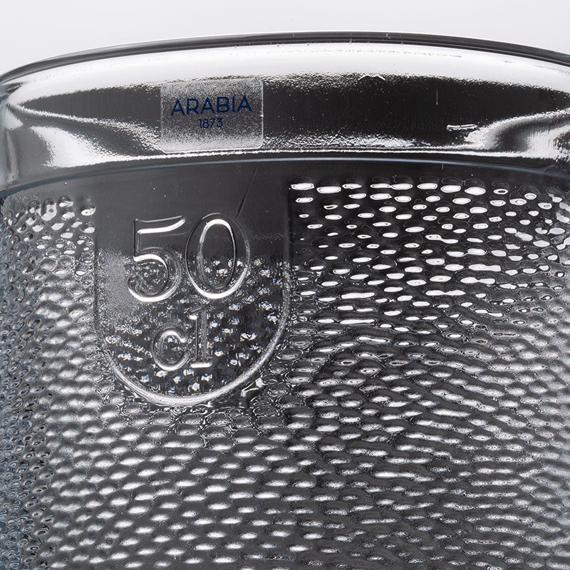 ビアグラス500mlは満水で500mlではなく、クリア層とエンボス層の切り替わりラインまで注げば、500mlぐらいになるようにデザインされています。このラインは、フィンランドの飲食店でビールを注ぎ入れる時の目安として使われているそうです。だから、500ml缶のビールを注ぎ入れるとイイ具合に収まります。また、500mlサイズは日本でいう中ジョッキです。一般的な日本の飲食店で使われている中ジョッキは重さが800gぐらいありますが、このKrouviは650gぐらいと少し軽く、中ジョッキとしては重くありません。日本の中ジョッキに慣れていれば、重くは感じないし、フォルムがぽってりしているので安定感もあり、持ち手も大きく、とても使いやすいビールジョッキだと思います。