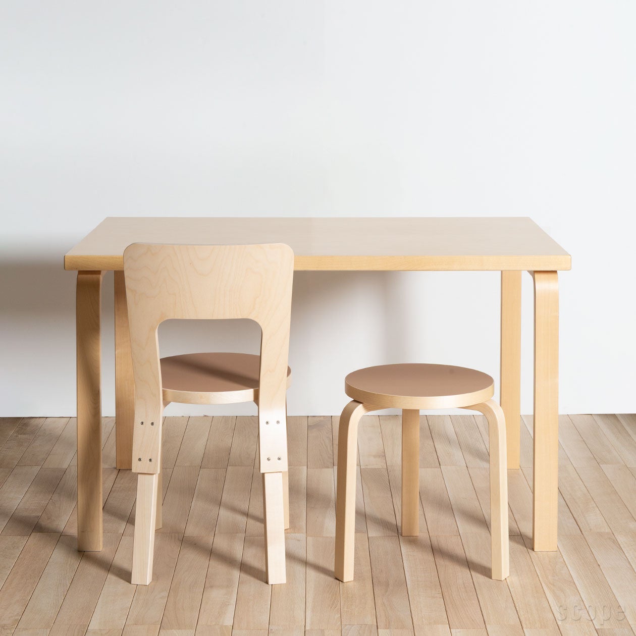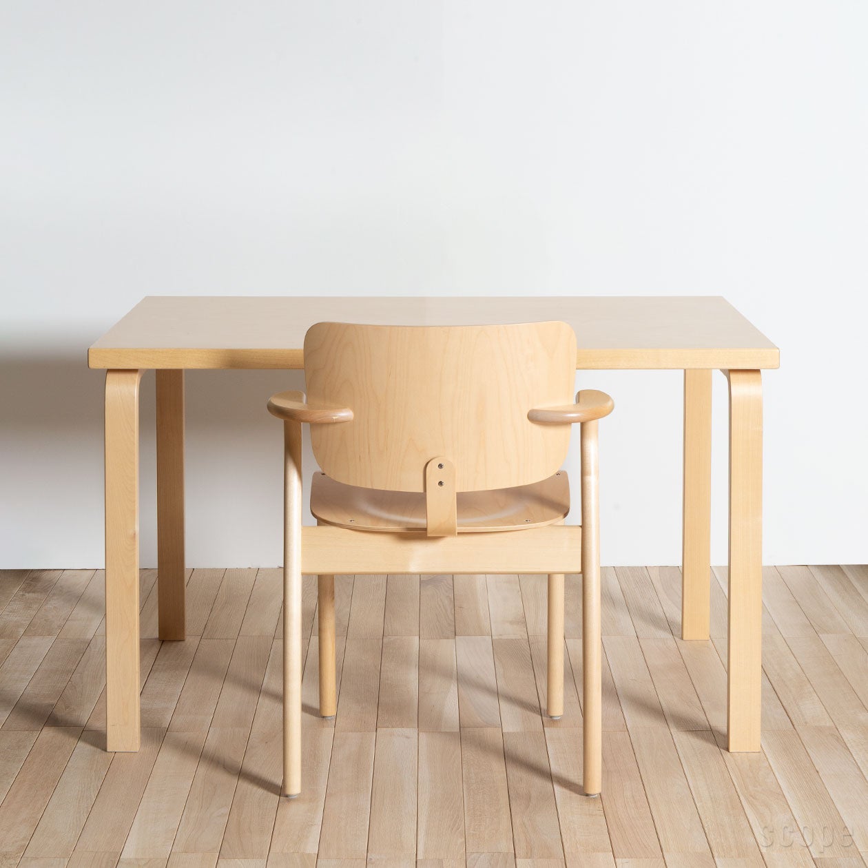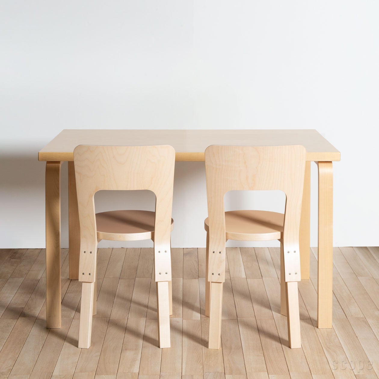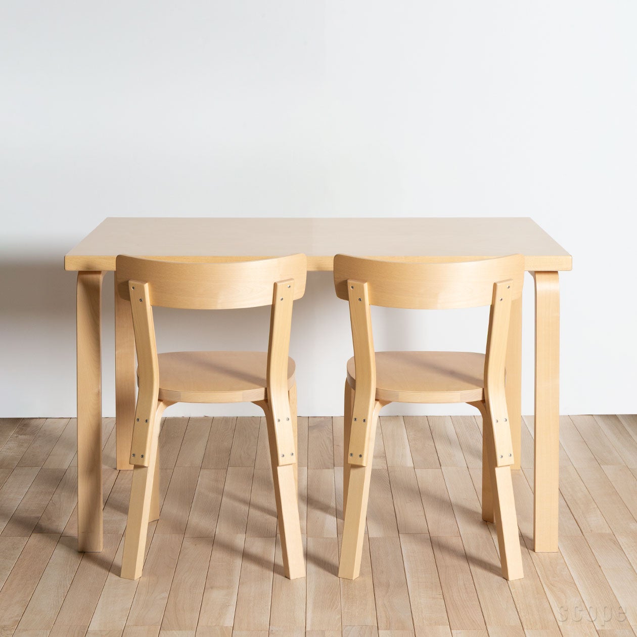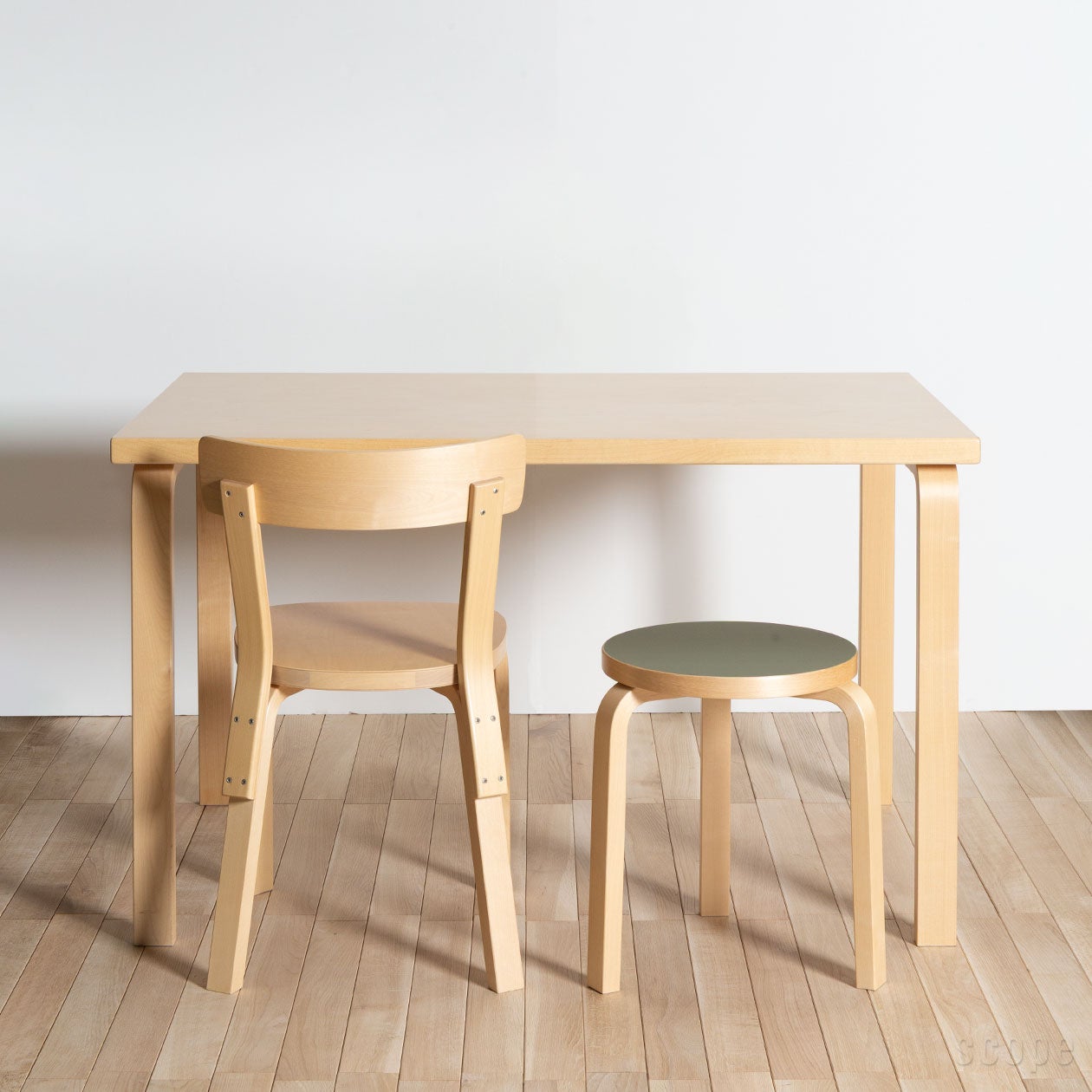 1935年にアルヴァ・アアルトによってデザインされたテーブル。Chair69も同じくアアルトによって同年にデザインされていて、どちらにもL-レッグが使われていますからシンプルながら特徴はあり、当然相性も良いです。特に81BテーブルとChair69は、サイズ的バランスも抜群で、実に無駄のない4人掛けダイニングセットだと思います。Chair69は幅が44cm(背もたれ部分で最大44cm、座面は39cm)。81Bテーブルはテーブル長辺が120cmで、テーブルの脚と脚の間(椅子が収まる幅)は103cm。そのスペースにChair69を2脚並べると椅子と椅子の間には15cmの余裕が生まれます。ゆったり余裕がある訳ではないけれど狭いという印象もありません。また、日常的には4人までの使用をオススメしますが、短辺にスツールなどを足せば、6人まで使用することは可能です。思い出してみれば、我が家も実家を建て直す前は、このサイズ感のダイニングテーブルにお世話になっていました。6人家族で120×73cmサイズのテーブルを囲んでいたのですが、テーブル上もそこに集う私たちもいつも一所にギュッとまとまっていて、にぎやかな思い出として今でも記憶に残っています。そして新居が建ち、広くなったダイニングルームに合わせて大きなテーブルが新調され、120cm幅のテーブルは私の勉強机として第二の役目を果たしました。そして私が実家を出た現在、母の洋裁用デスクとして活躍しています。家族や住まう環境の変化に応じて別の用途を見出すことが出来るのは、このサイズならではという気がします。さすがに我が実家のテーブルはこれにてお役御免となりそうですが、これがアアルトのテーブルだったなら、そのデザイン性、流行りに左右されない根強い人気とその価値も相まって、さらに次の活躍の場も見出せたのかもと思うと、アアルトデザインの魅力の底力を強く感じます。(スコープ 熊澤)