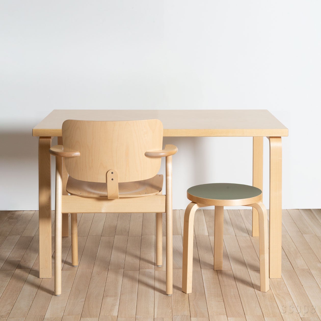 住みながら撮影をするというスコープアパートメント企画を2020年5月から再始動しました。長らく取り扱いのメインに据えてきました北欧、主にフィンランドの物で構築し、自分なりの北欧的集大成にすると決めていますから、そこにある家具はアルテックが多いです。一番最初に気に入った空間になりましたのがダイニングキッチンで、アルテックのテーブル81Bと95を二つ合わせて置いています。その周りは、とりあえず使っていたスツール60リノリウムがしっくりきているので、多分このままになります。スツール60だけでも全然困ることはないですし、掃除も楽だし、2つ並べているので大きなテーブルになっていますが、周りがスツールだからか圧迫感なくスッキリ快適です。大きなテーブルにスツール沢山、このmysuomiハンナさんの手法はナカナカよいです。こうして二つのテーブルを組み合わせて大きなテーブルにするというのは実に先々無駄がないと僕は思っています。やはり物が大きくなればなるほど用途も場所も限られてきますので。この2つでしたら使い道はいくらでもみつかります。スツールもしかり。ただ、アルテックのテーブルはとても軽いので使っていると結構ズレます。ですから、こうして1辺は壁に付けて置いた方がズレたとしても1方向ですから面倒ではないと思います。そう、結構ズレるのです。アルテックのテーブルを二つ一緒に使うのでしたら、その軽さから結構動く、結構ズレる、そこは頭に入れて検討した方がいいなって細かいんですけど、そんなことを思います。