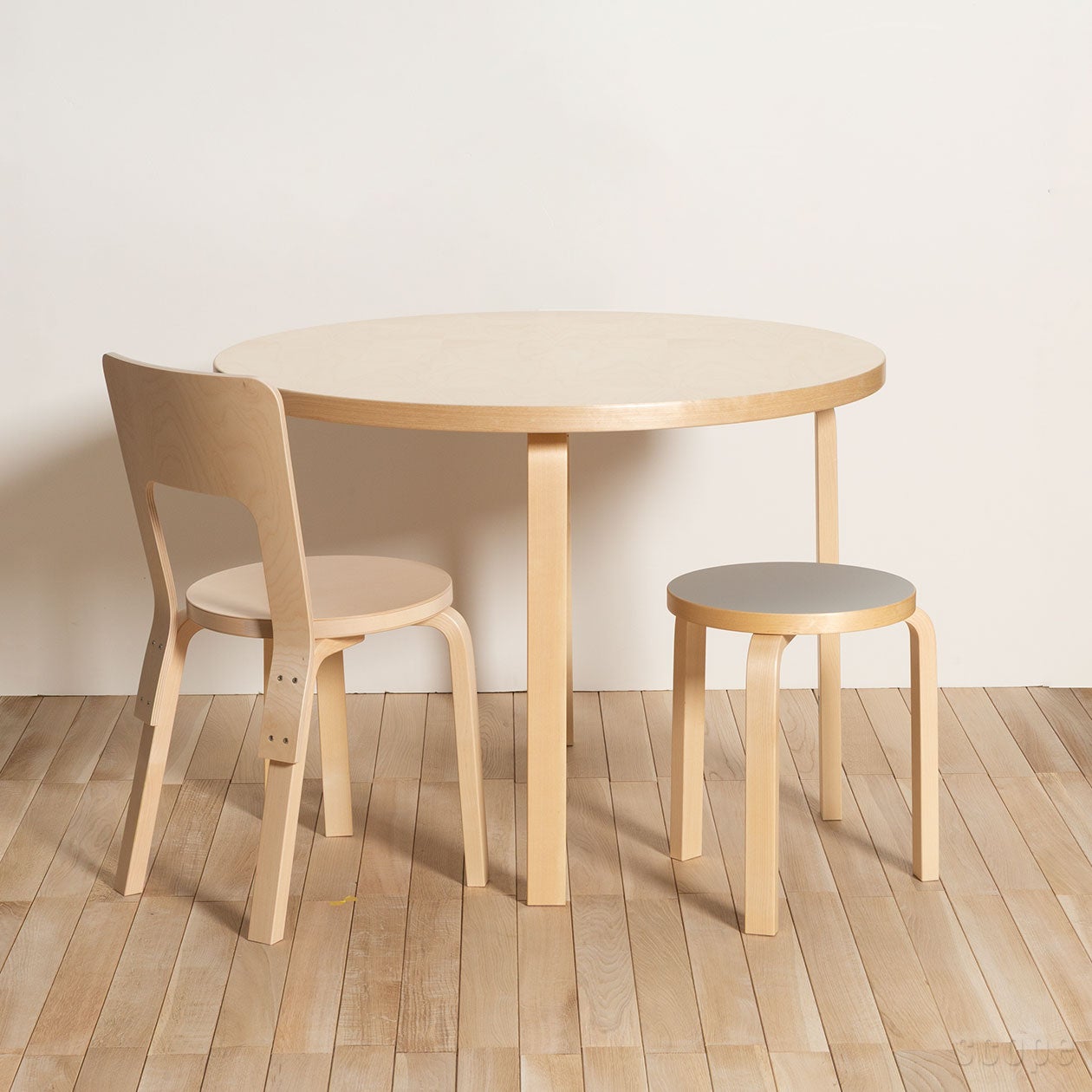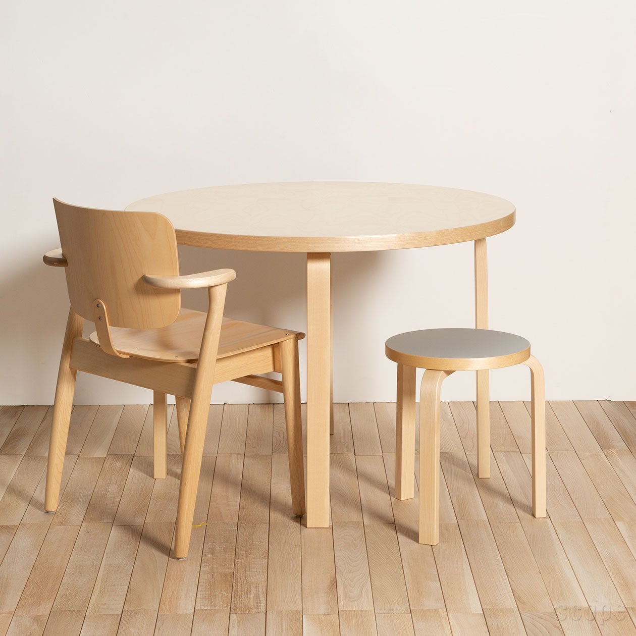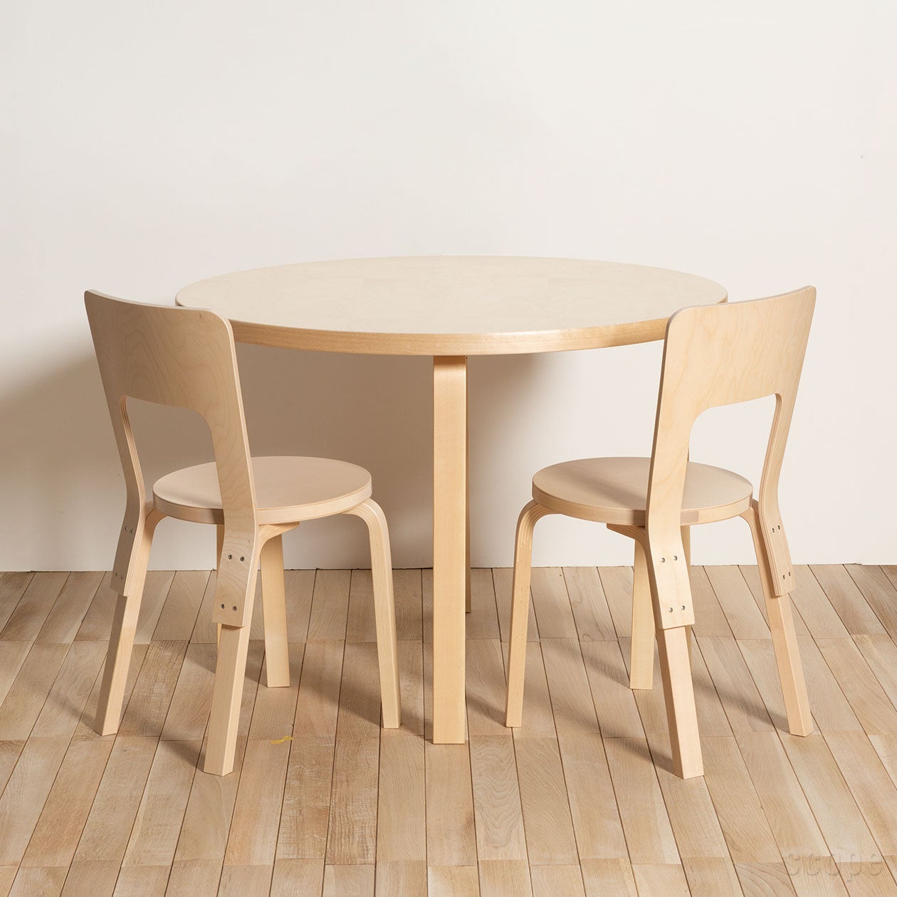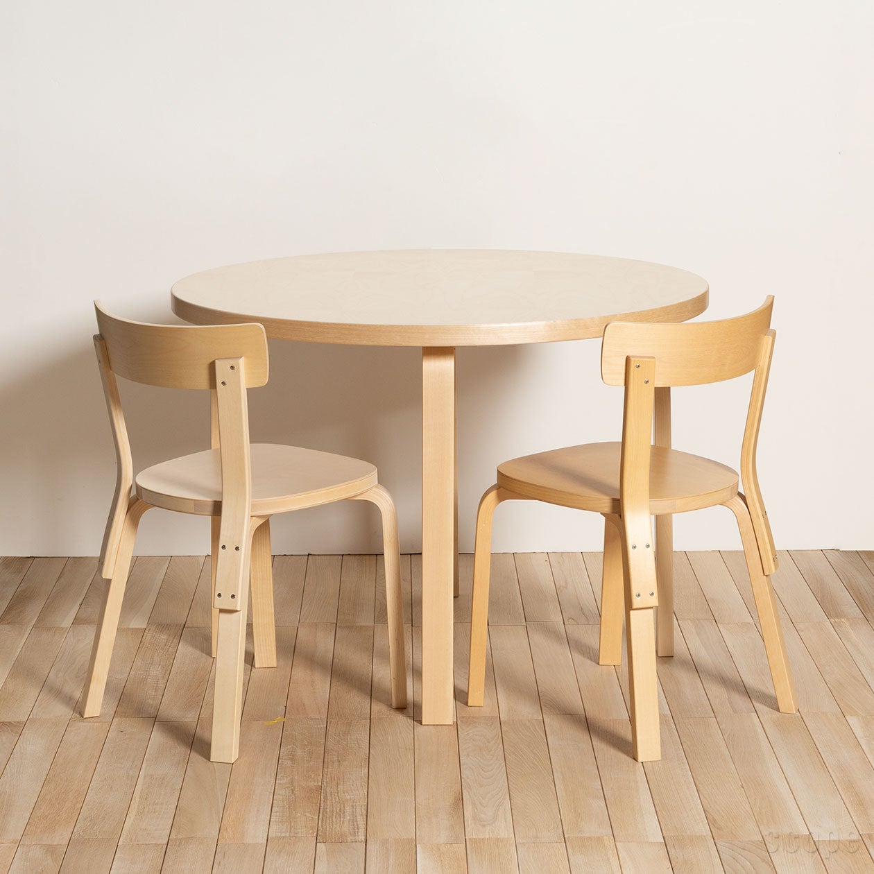 90Bテーブルは、 直径75cmの円形テーブルです。脚はバーチ材にスリットをいれて曲げたLレッグ、天板はバーチ材で枠組みを作り、上下の面に薄い板を貼ったフラッシュ構造、つまり箱状になっていますから無垢板(1枚板)の天板に比べてかなり軽量です。90Bテーブルぐらいのサイズでしたら、女性一人で持ち上げて移動することも出来てしまいます。かなりコンパクトなテーブルですが、大人二人でダイニングテーブルとして使うことはできます。このテーブルの脚位置は、スツール60と同じように3本の脚が天板から少し飛び出る形状となっているので、テーブルの脚と脚の間(椅子が収まる幅)は63cmとゆとりがありますから、一緒に使う椅子はそれほど選びません。ただ、3脚をテーブルに合わせるのでしたら、テーブル下への椅子の収まり具合を考えましてChair69のような小振りな椅子を選んでいただくのがバランス良いと思います。また実際に3人でテーブルを囲みますと、隣同士の距離感は十分に保てますが、食事をしようと食器を並べましたら卓上のスペースが手狭になります。3人で使うのならティータイム、2人で使うのであれば食事でも使うことができる、そんなサイズ感をイメージして検討してみてください。