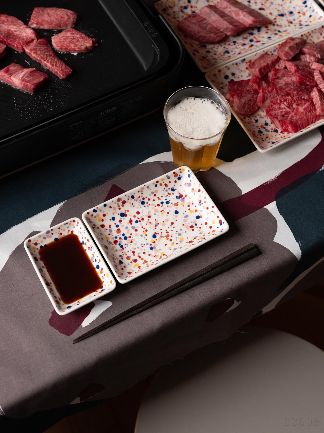 オイバ・トイッカ本人もこのシリーズの原型となった食器を愛用していました。そして使うたびに長方形だから効率よく収納できるし、綺麗に並べることもできるからいいんだって説明をしてくれたことを今でもよく思い出します。そして実際、その通りなのです。複数の食器を組み合わせてテーブルセンターに並べる時には、想像以上に素敵なテーブルになりますし、それがとても簡単に、誰にでもできるのだから素晴らしい。スクエアプレートであることに加え、サイズが一つ小さくなると半分になる規格サイズ、A4の短辺=A5の長辺、A5の短辺=A6の長辺、A6の短辺=A7の長辺だから、沢山の食器を使うテーブルでも、線を揃える意識で並べるだけで整って見えます。また、お皿が多くてもテーブルの上が整理整頓されてスッキリ見えますし、隙間なくお皿を並べることができるのでより沢山の食材、より沢山のお皿を並べることができます。焼肉をするときはA4に焼野菜やチシャバ、ゴマの葉を盛り付け、A5には数種類の肉、A6にホルモン、A7には味噌といった具合に並べましたら凄くナイスな焼肉になりました。焼肉の時は油も飛んで汚れますから何か敷きたくなるのですが、お手頃な布を焼肉専用テーブルクロスとして敷いておけば見た目にも綺麗で、染みになっても焼肉専用であれば気楽です。使い終わったら洗濯すればよいだけ。意見がわかれる所だとは思いますが、僕は何度も使えるから凄くイイ方法だと思っています。