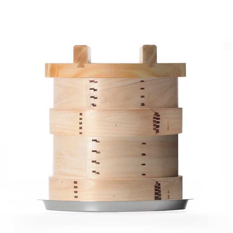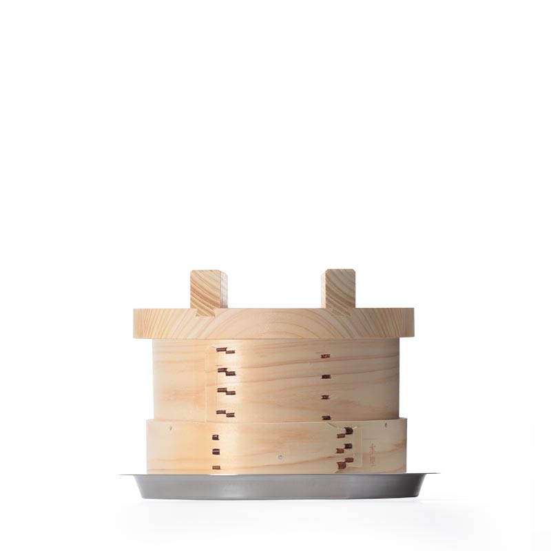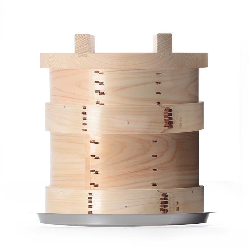 木曽さわら、吉野ひのき等、日本で採れた材料を使用して作られた和蒸籠。(残念ながら、2019年に和蒸籠の中に敷かれる竹簾を作っていた職人さんが引退されたとのこと。2020年以降の販売分から、その部分だけ中国産のものを使用することになりました。)和蒸籠は調理中の水分を適度に吸収するので金属製の蒸し器のように中身が水滴で水っぽくなることがない。さらに分厚い蓋が蒸気をしっかりと閉じ込めるから、蒸籠内の温度が保たれてご飯や野菜をじっくりと蒸かすことができる。気をつけるのは、鍋の水を切らさないことくらい。古くから伝わる和蒸籠、実に理にかなったつくりになっている。蒸籠のサイズは4種類。大きいほうの八寸と九寸は浅いタイプもある。自宅で一緒に使う鍋のサイズや、蒸籠でどんな料理を作りたいか、妄想力と計測力を駆使して、慎重に選んでいただきたい。撮影合宿に持ち出して奮闘格闘している様子はこちらより。参考にしてみてください。
