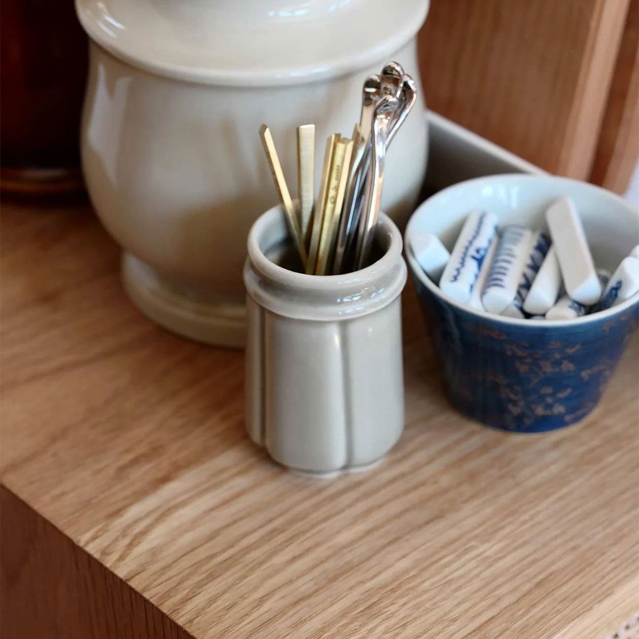 小さなカトラリーを収めるアイテムとして最初に作ったのが、2017年1月発売のキッチンツールキャニスター70mm瓜型。ピックのような小さなツールを収める道具が見つからないという、小さな穴を埋めてみました。ただ、キッチンツールキャニスターのバリエーションが増えていくなかで、それに沿った雰囲気、より安定した形状にしたくて、2021年12月に70mm瓜型は廃番に。そして、そこから長らく新作に取り組んできました。紆余曲折しながらアイデアを固め、試作を重ねて3年後に完成。大量生産が難しいアイテムということもあり、コツコツと在庫を溜め、結局のところ発売までに4年も経過してしまいました。